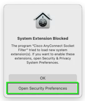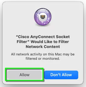 توجه: اگر به macOS 11.0 Big Sur ارتقا دادهاید، مطمئن شوید که به جدیدترین نسخه Cisco AnyConnect برای جلوگیری از مشکلات سازگاری بهروزرسانی کردهاید.